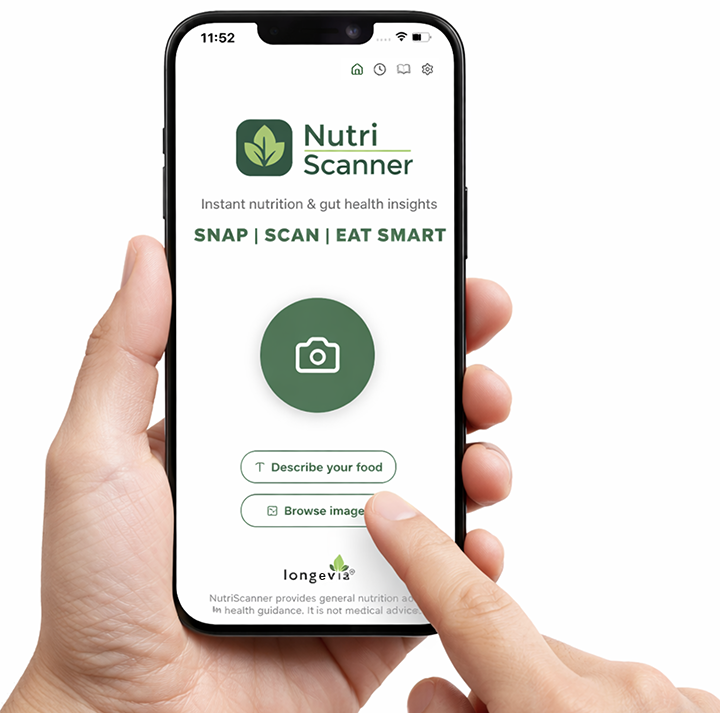 Scan a barcode, describe your food with text, snap a photo, or upload from your library. NutriScanner instantly provides dual scores out of 10 using an intuitive Red/Amber/Green display: one for Nutrition, one for Gut Health. Scroll down for detailed insights into nutritional content, microbiome-affecting ingredients, and how your food choices may impact your overall health.